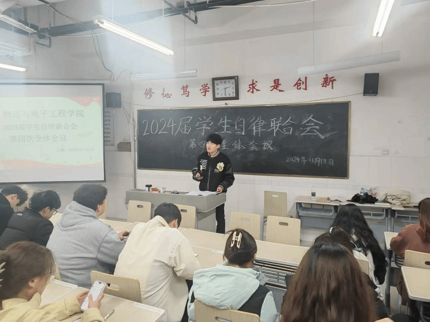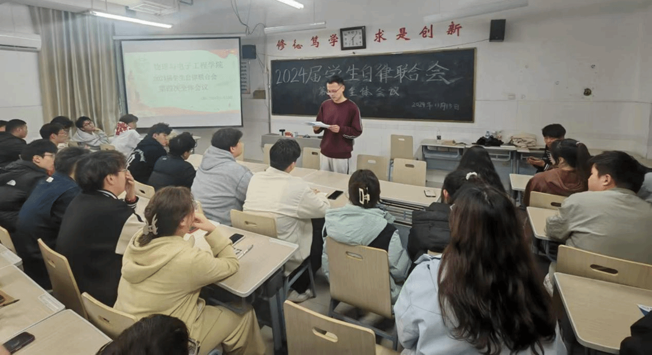 为给同学们提供良好的学习氛围和安全的生活环境,11月13日,球盟会在综合实验楼W502教室召开2024届员工自律联合会第四次全体会议。辅导员李晨出席此次会议。员工自律联合会主席戴竣彦主持会议。2024届自律联合会全体成员参加。