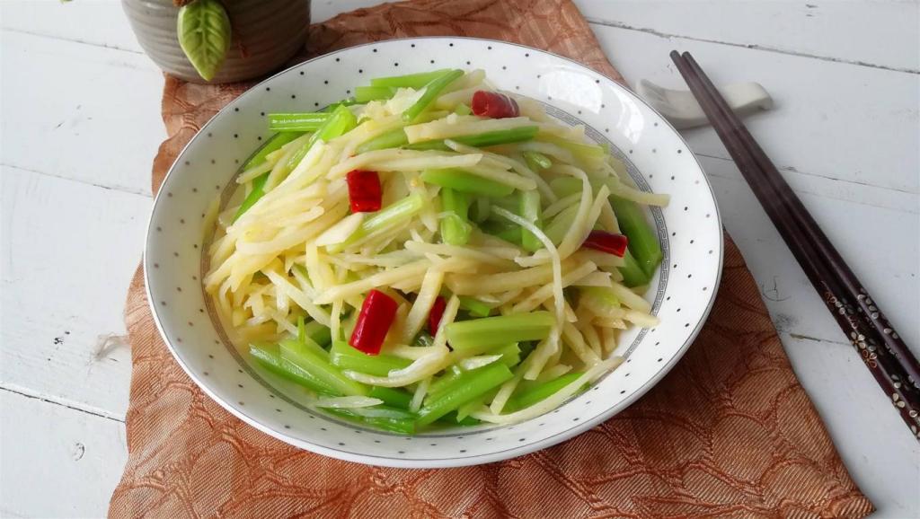 【芹菜炒土豆丝】所需材料:土豆2个、芹菜1把、油盐适量、葱1段、大蒜2瓣。